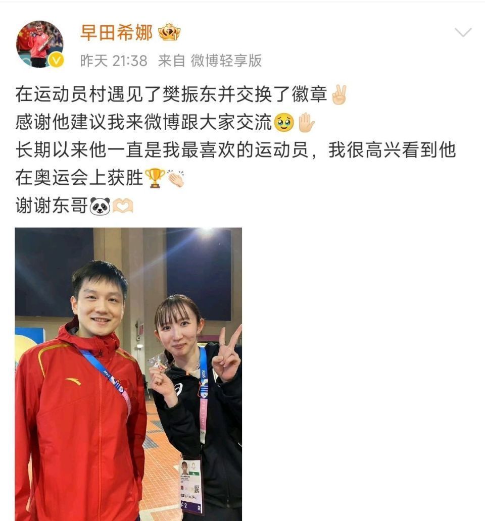 8月12日,日本一姐早田希娜入驻某博应对媒体,接着,早田希娜晒出与樊振东的合照,而且发文暗示:我方碰见樊振东,两东谈主交换pin,令东谈主感动,樊振东还给我方惨酷,让我进驻某博,樊振东一直是我方最心爱的率领员,很欣喜看到樊振东在奥运会上告捷拿到金牌。